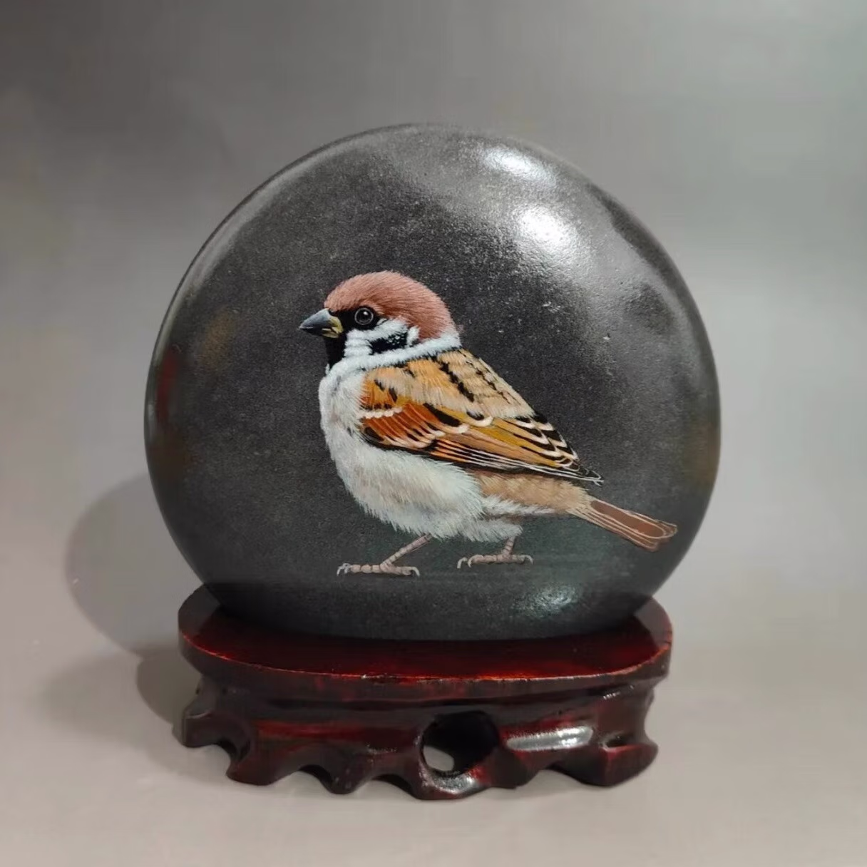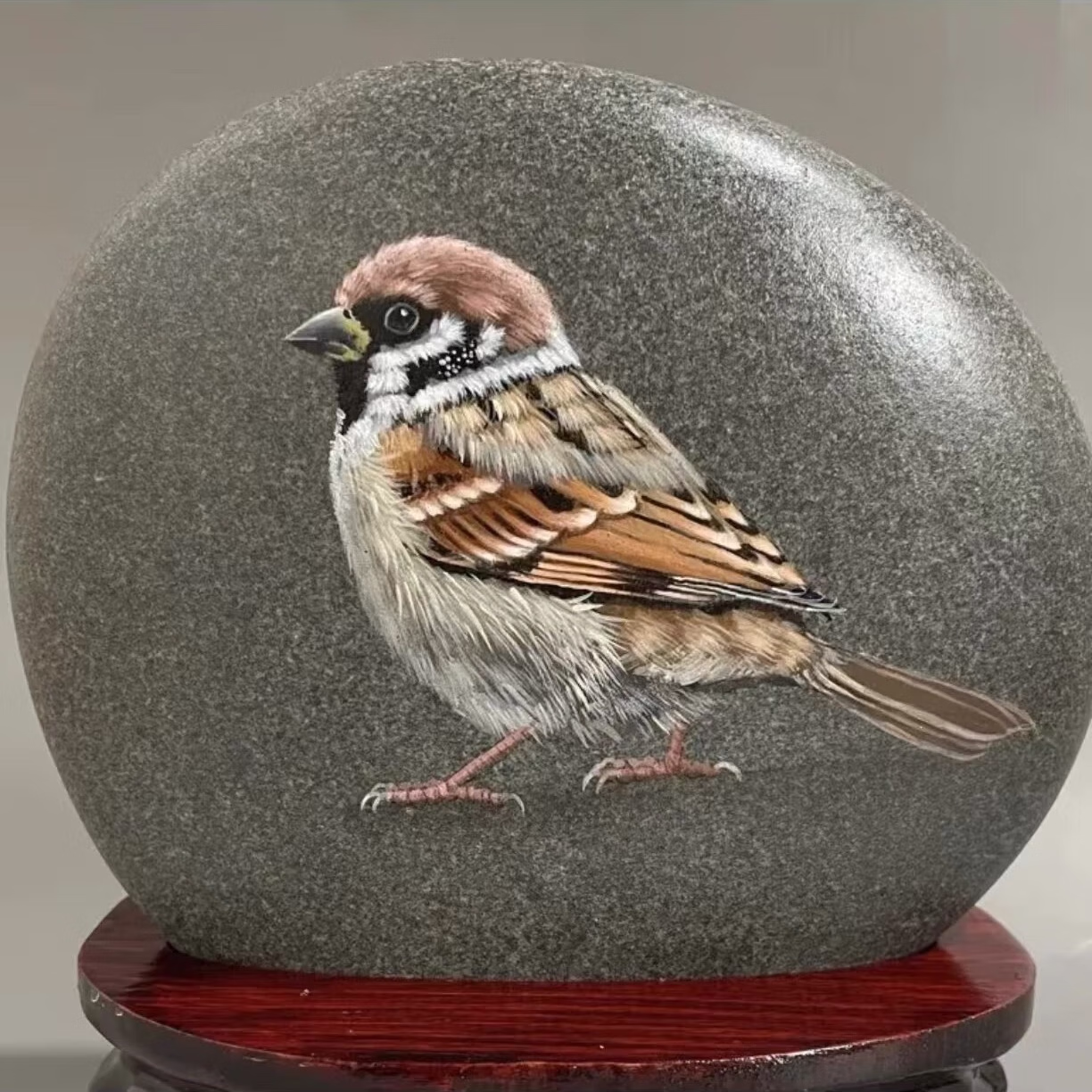 Handcrafted sparrow stone painting decorative art piece, intangible cultural heritage handiwork