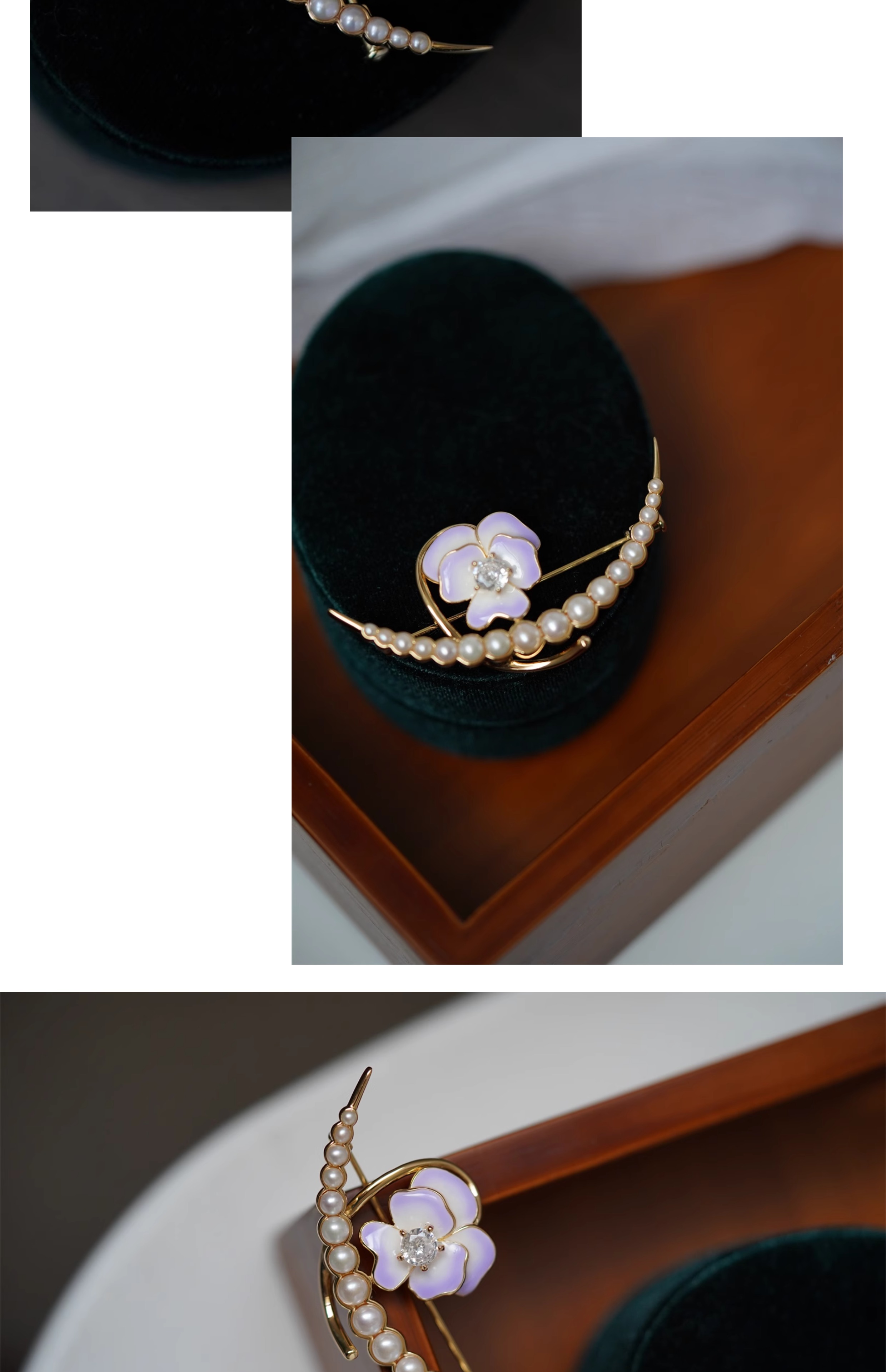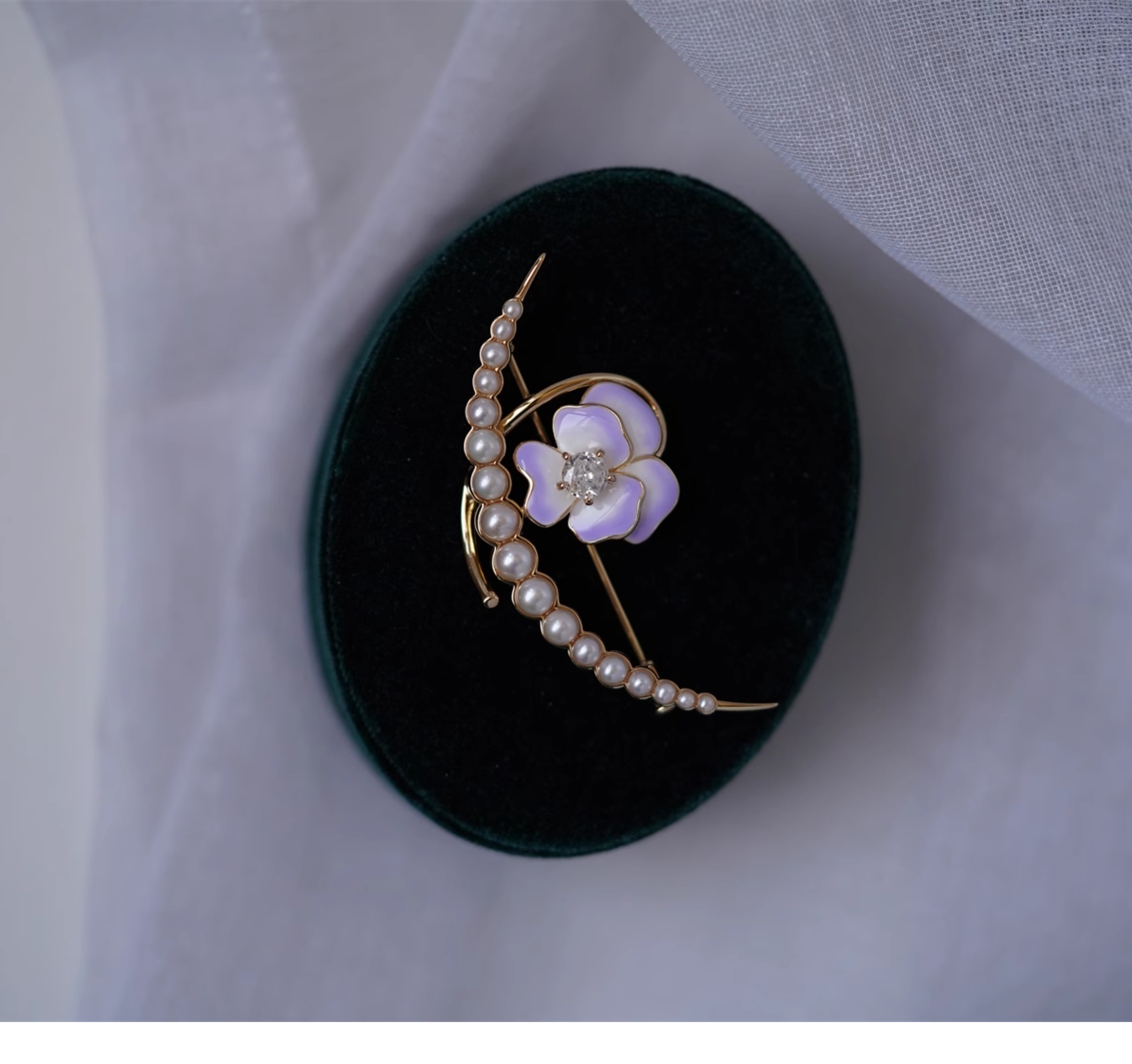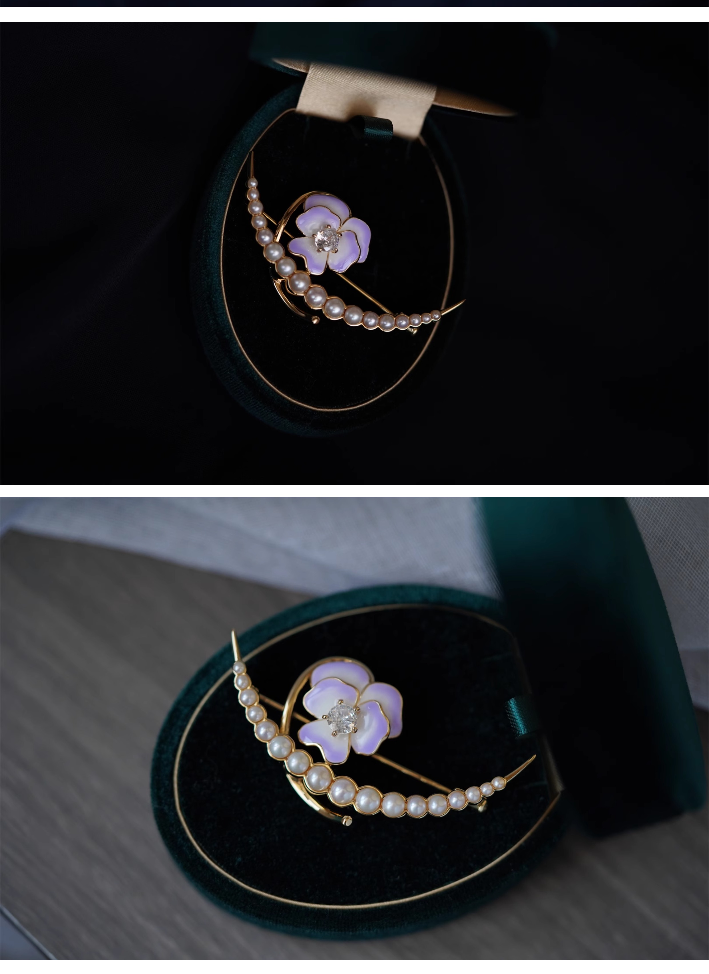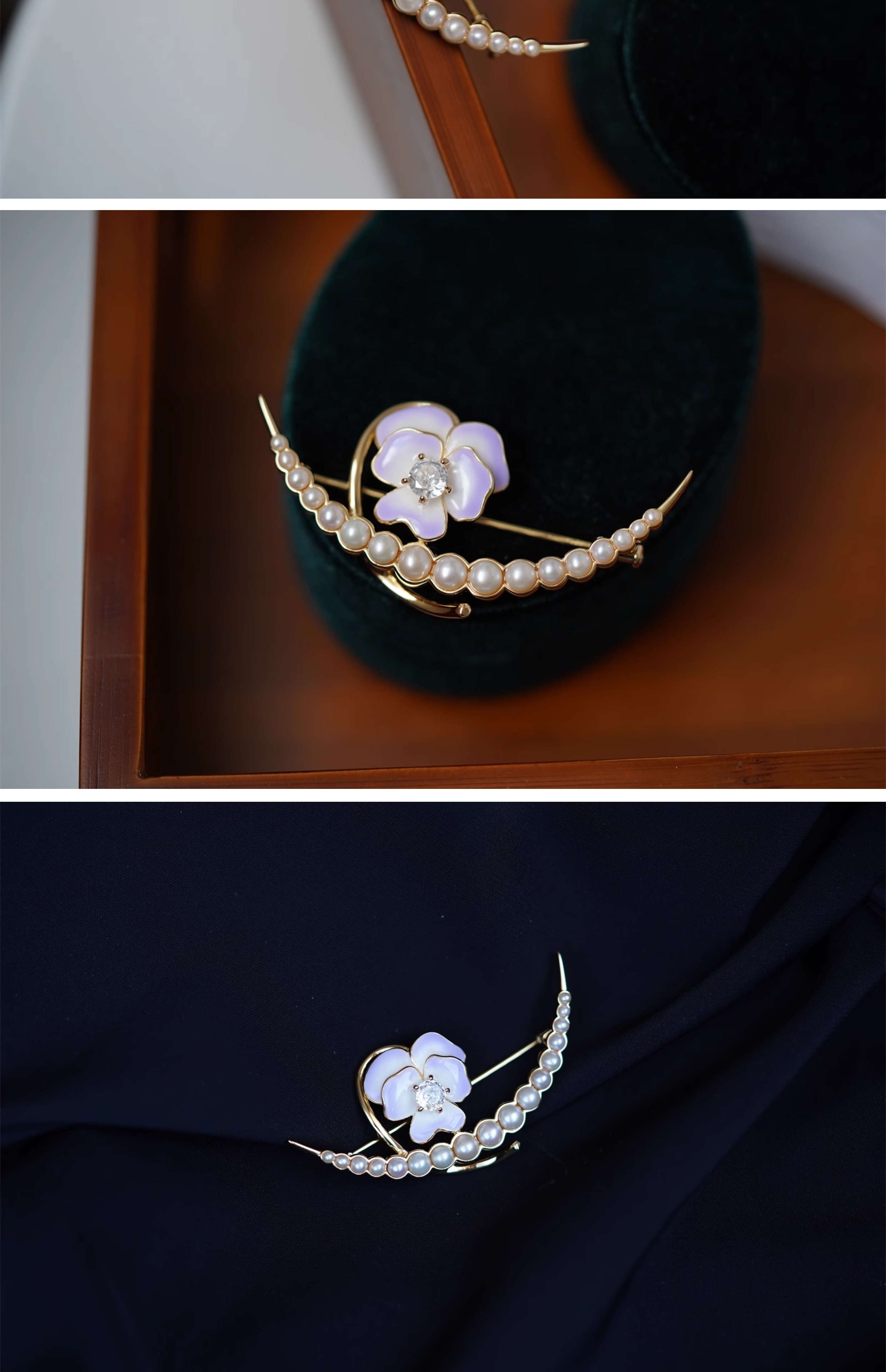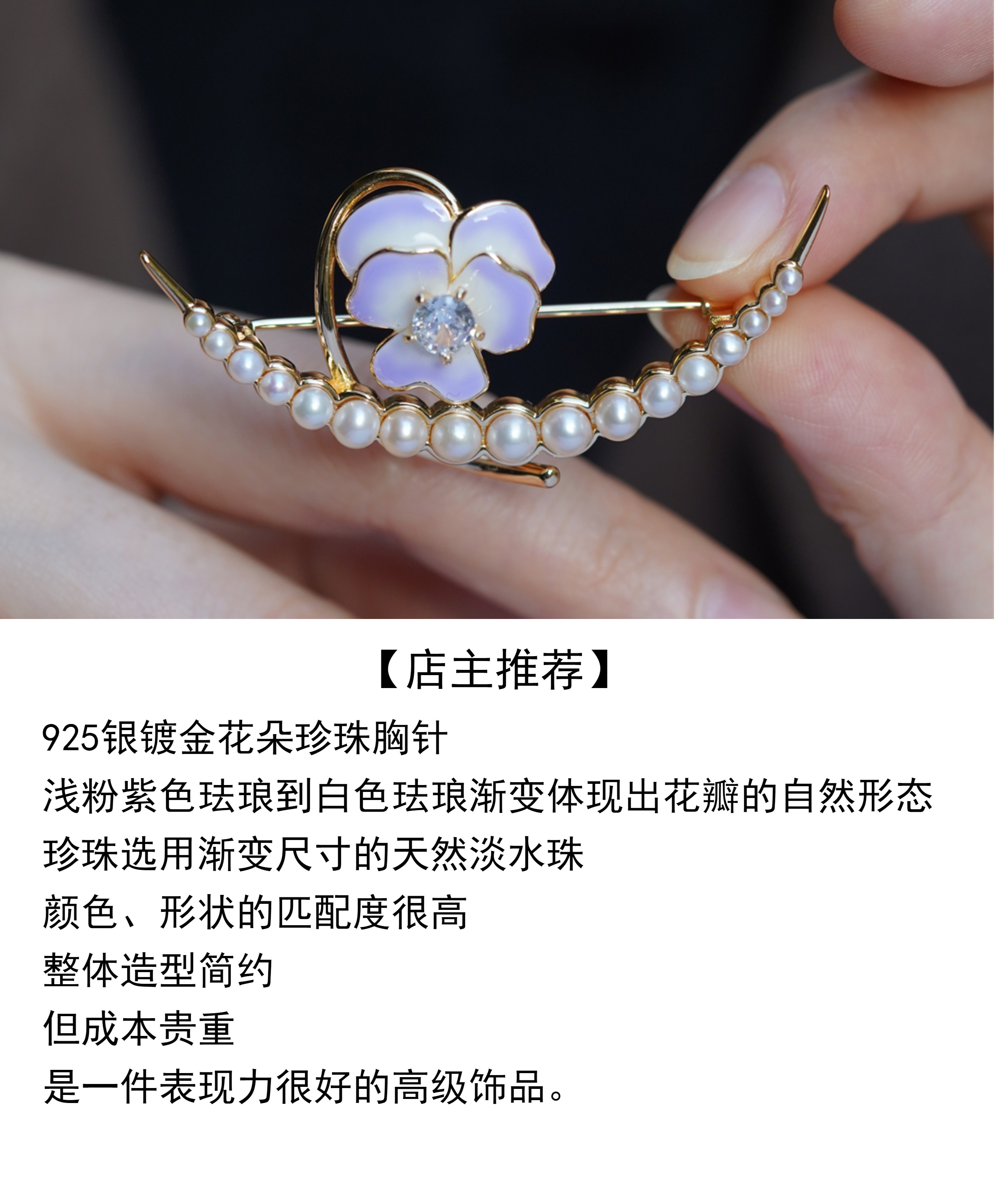喻棠italks|月半弯|925银镀金花朵淡水珍珠胸针珐琅渐变