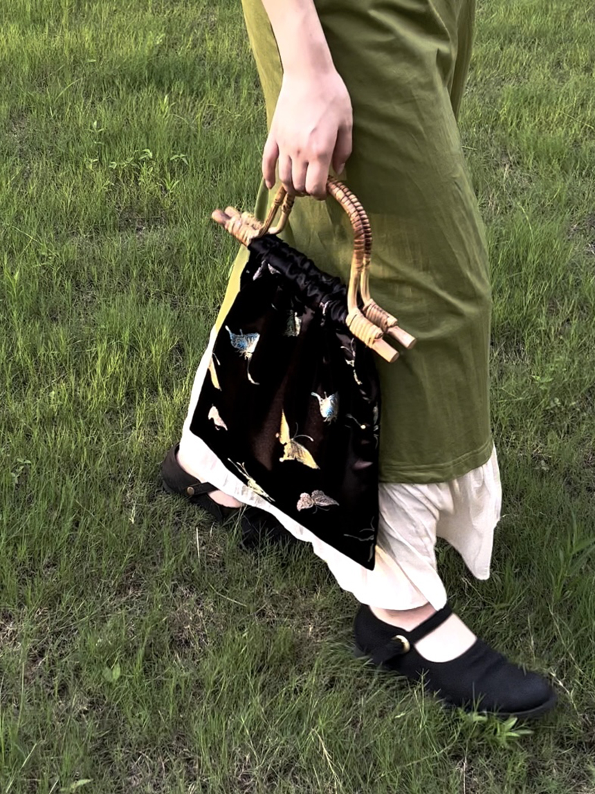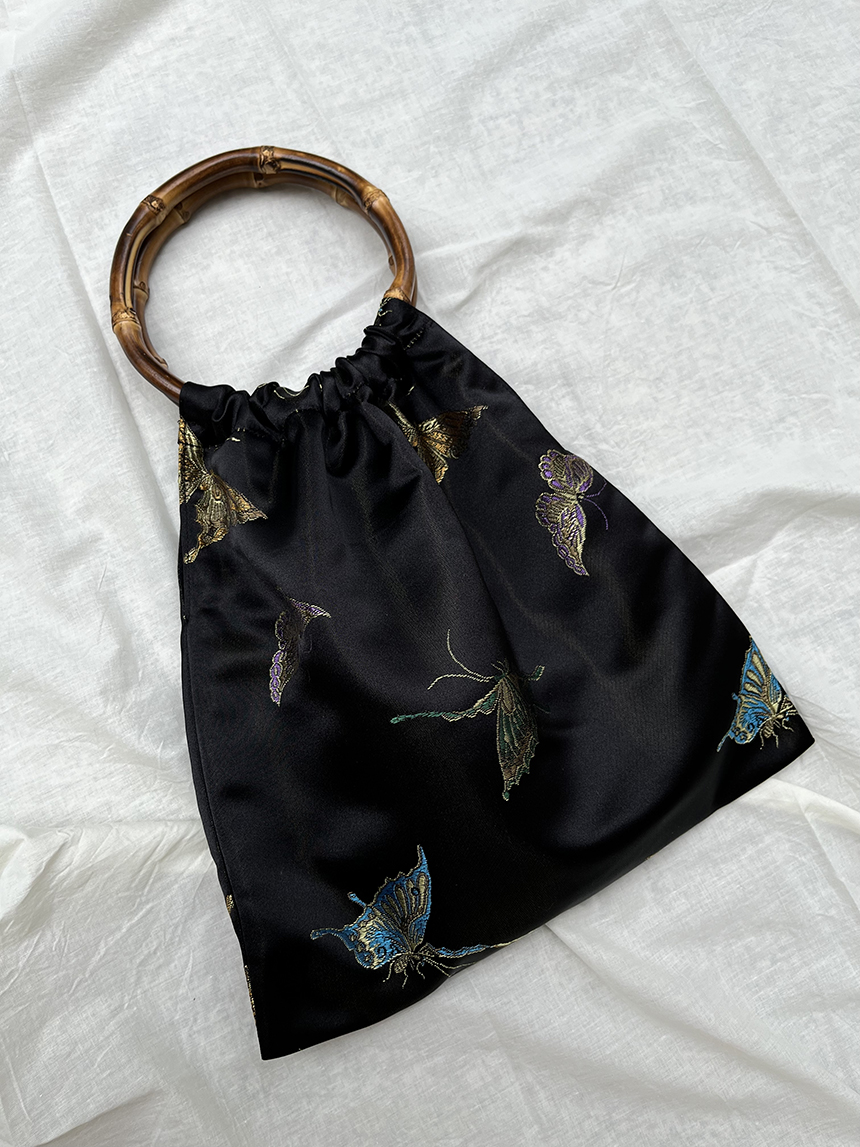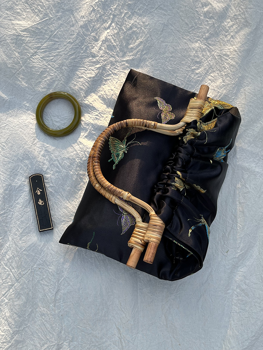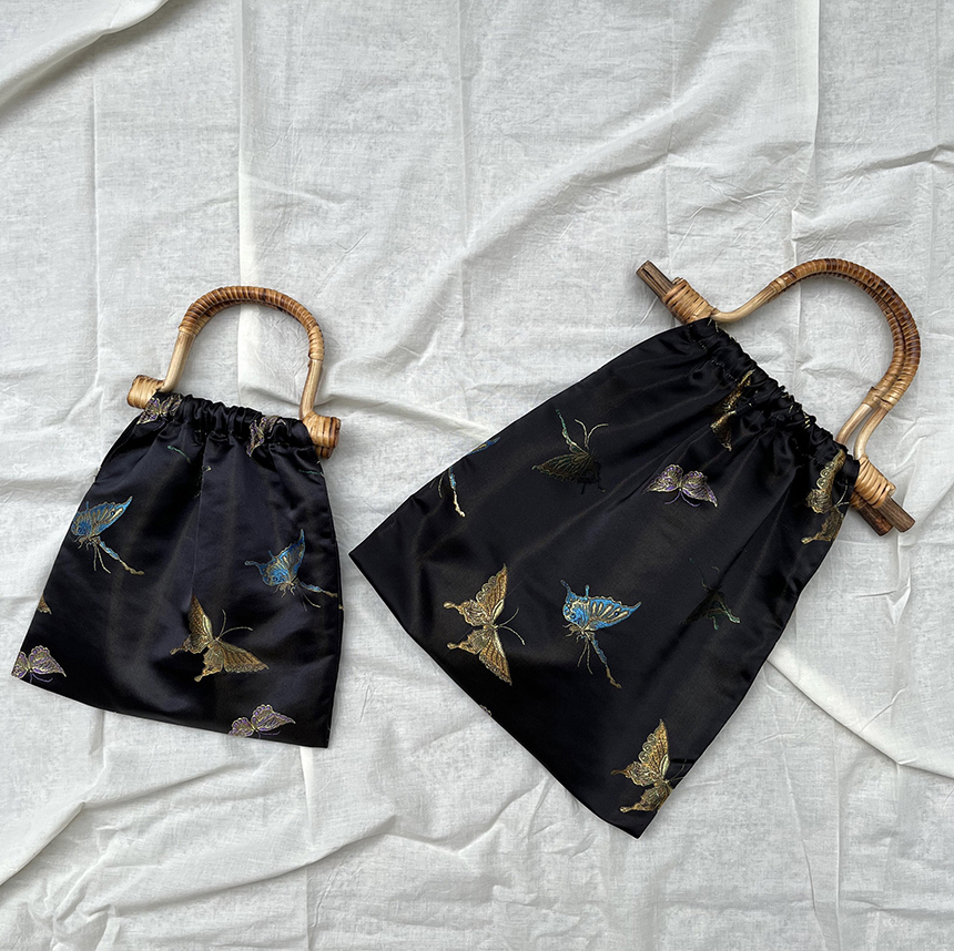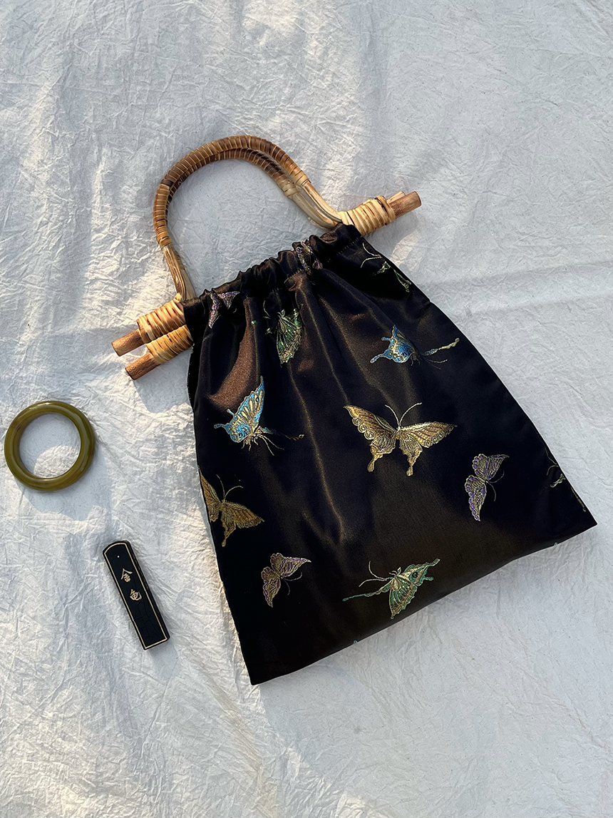 Blue Cottage 仲夏蝴蝶梦 黑金蝴蝶提花中式气质实木藤编手提包