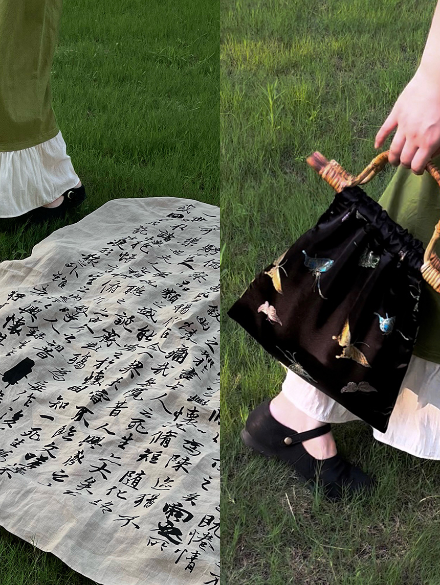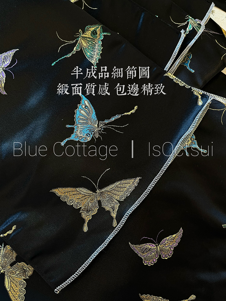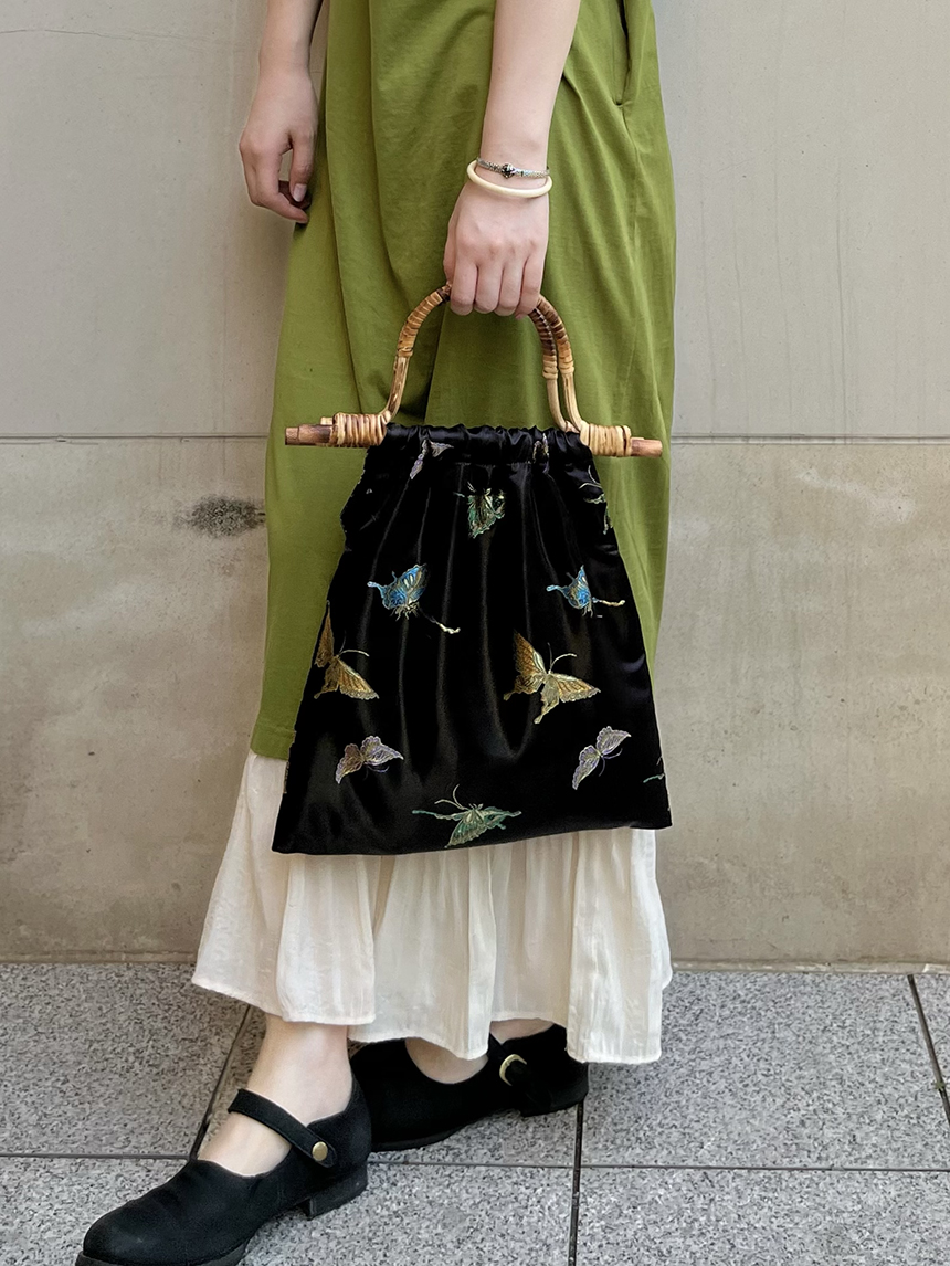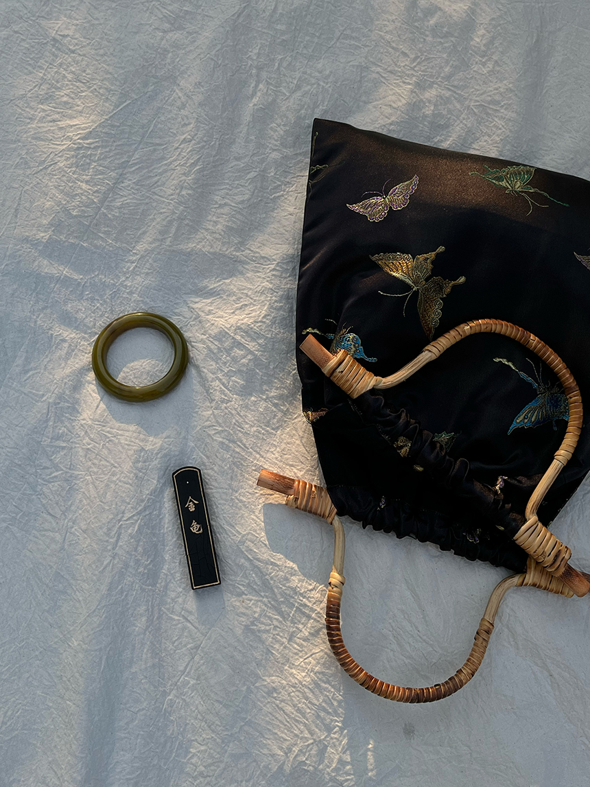 Blue Cottage 仲夏蝴蝶梦 黑金蝴蝶提花中式气质实木藤编手提包