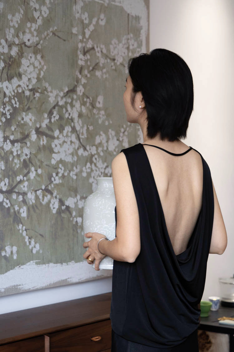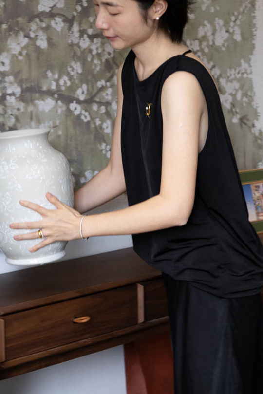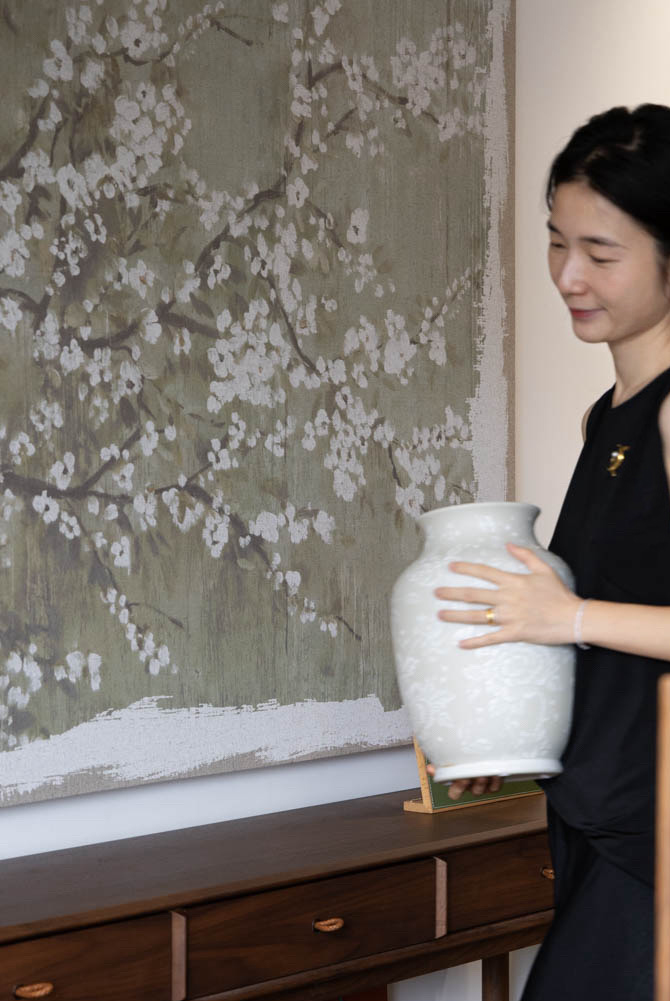 ( 雪梅收藏大幅画作 / 陶作品浮雕花瓶 / 三屉边柜 亦均来自品牌若奈 )