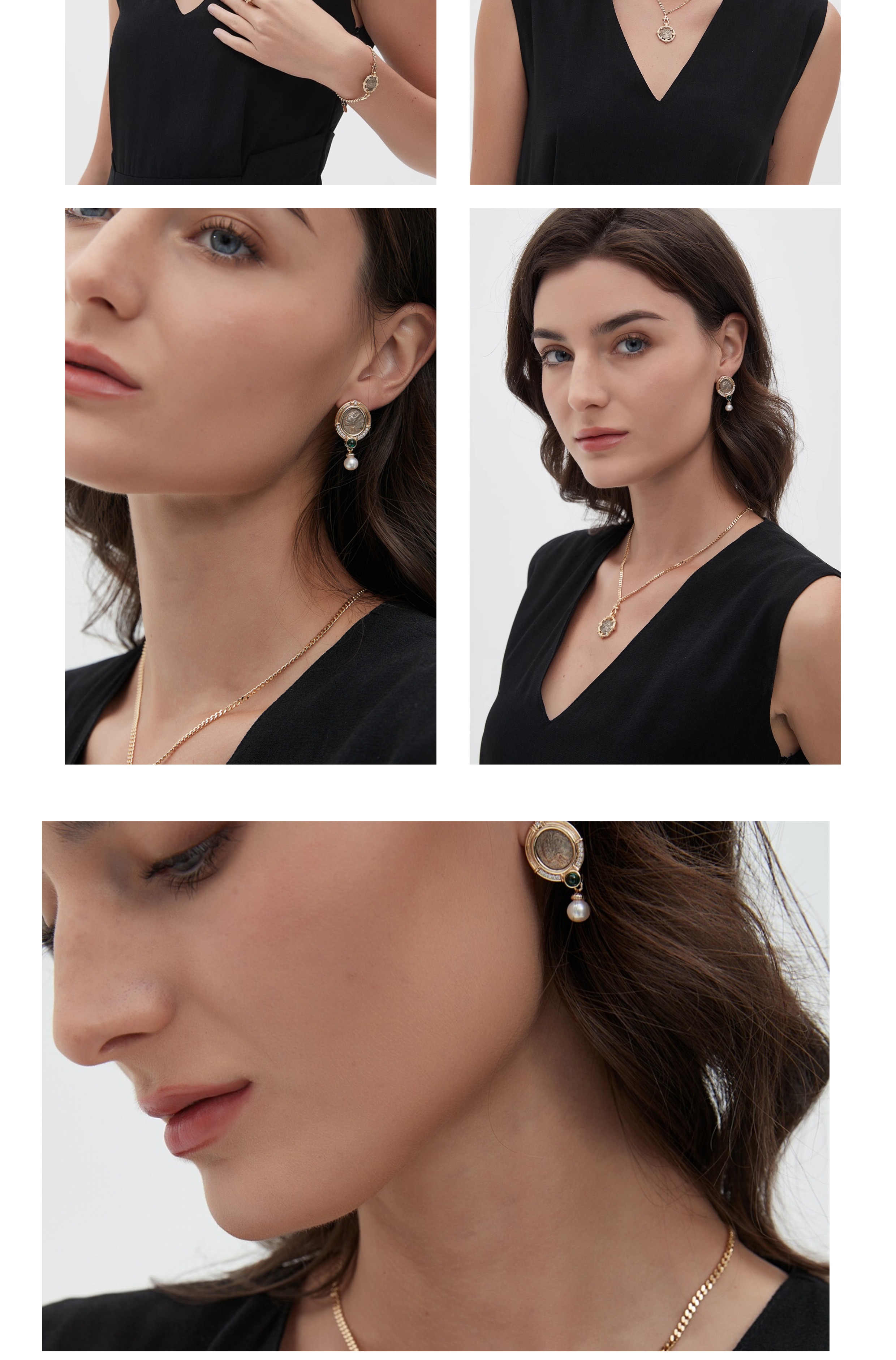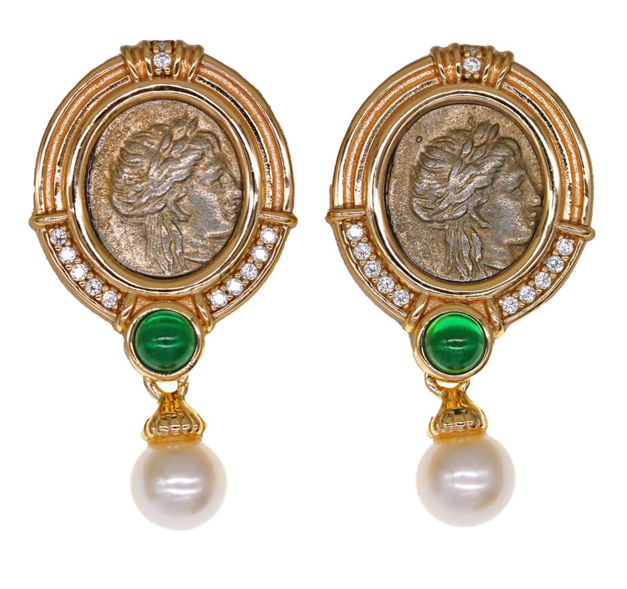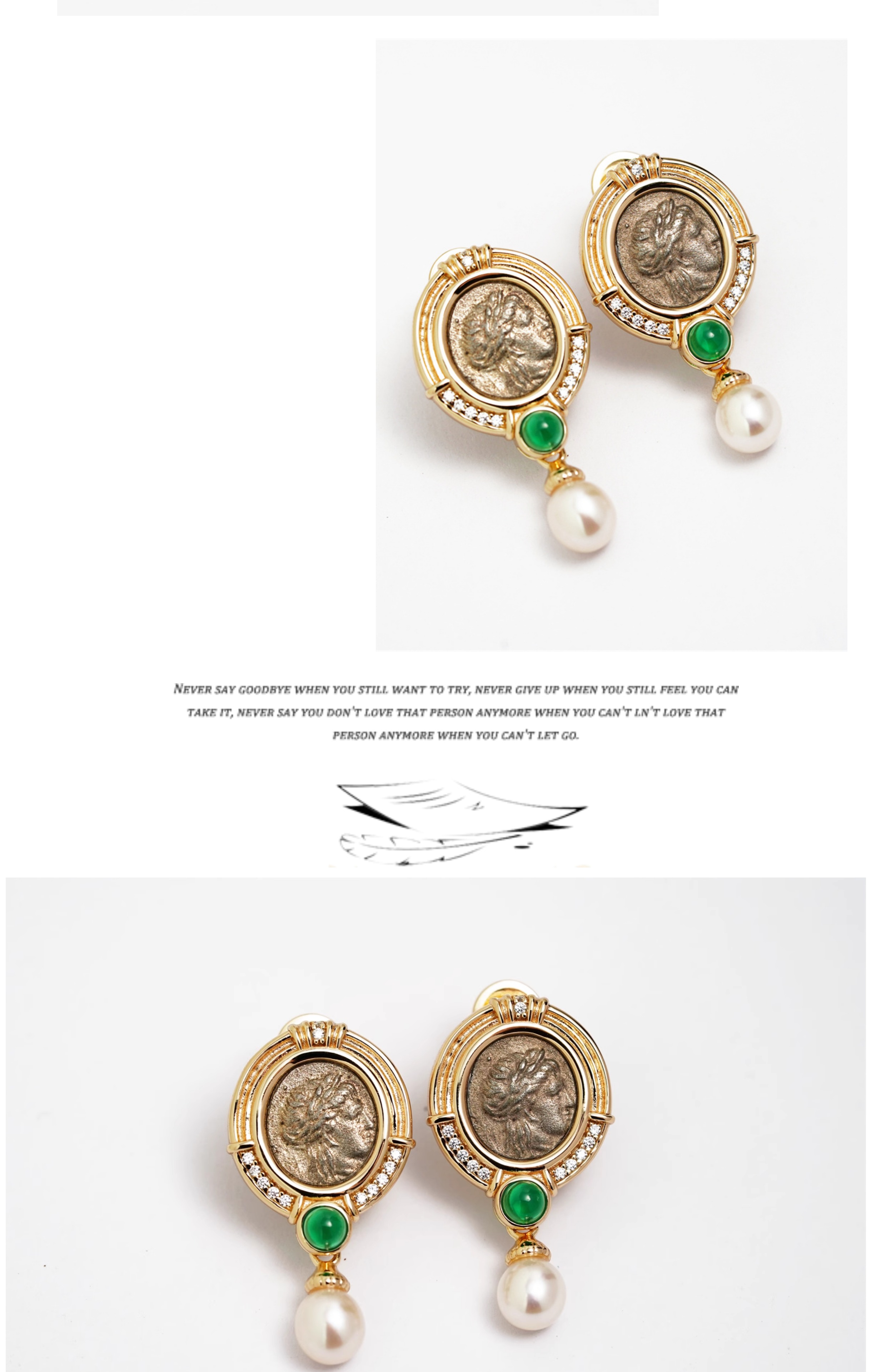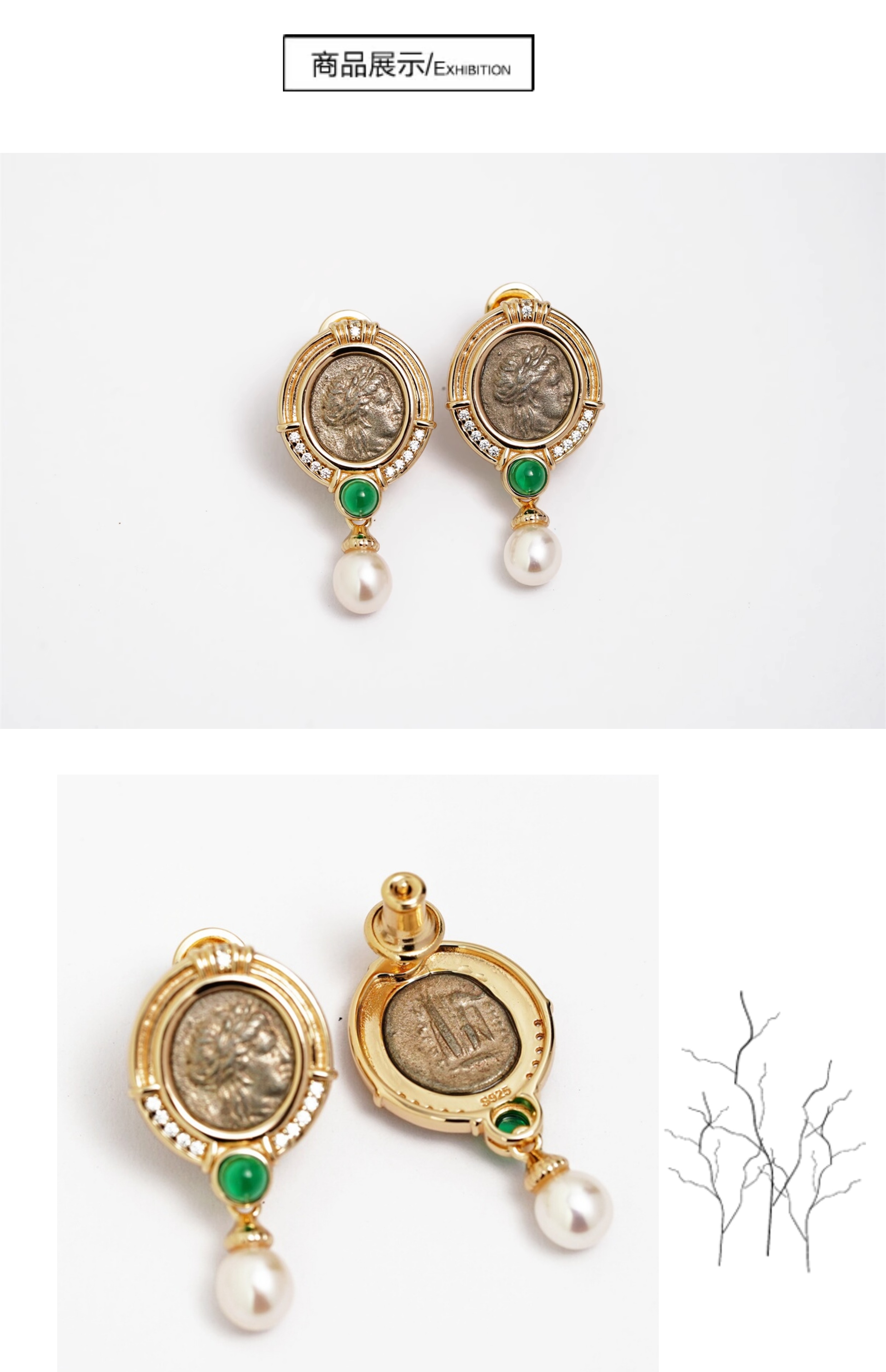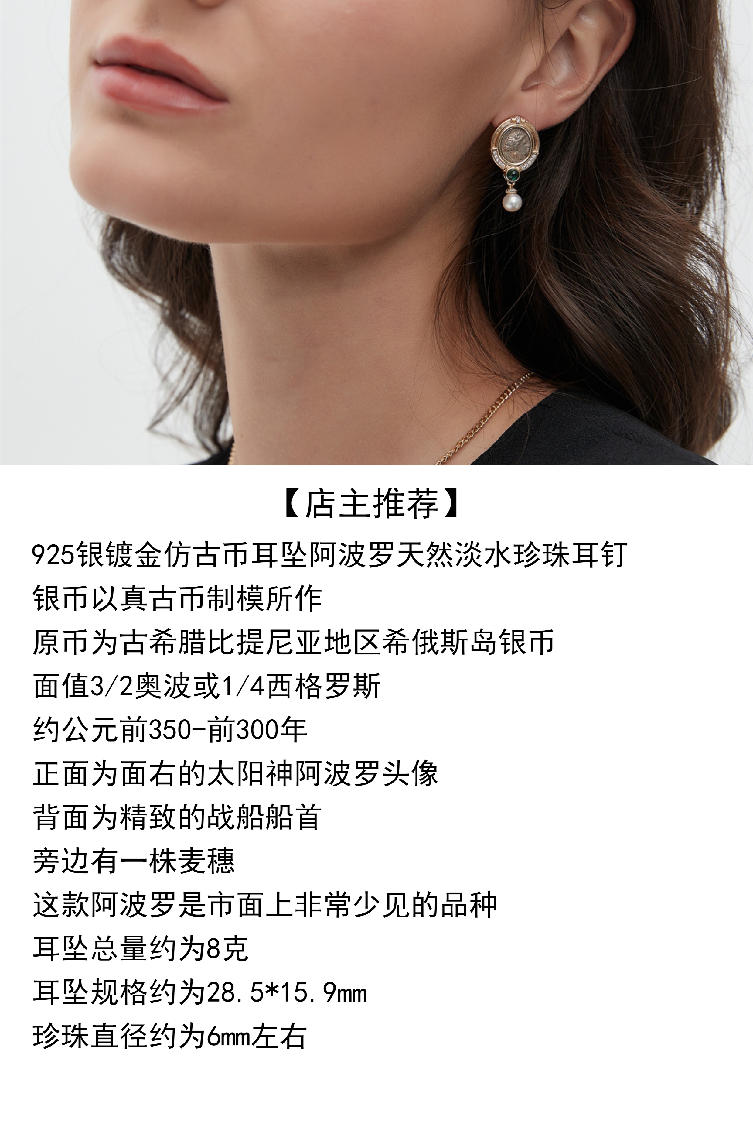 爱琴海余音|925银镀金仿古币耳坠阿波罗天然珍珠耳钉淡水珠